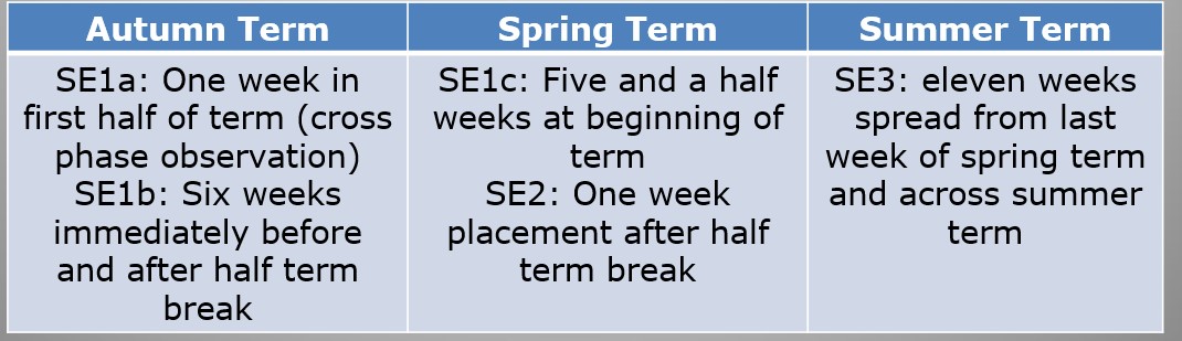 These blocks of school experience (SE) are structured as follows: SE1a, SE1b and SE1c within one of our partner schools, SE2 at a contrasting school or setting, SE3 in a second of our partner schools with dates roughly as below.