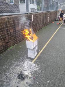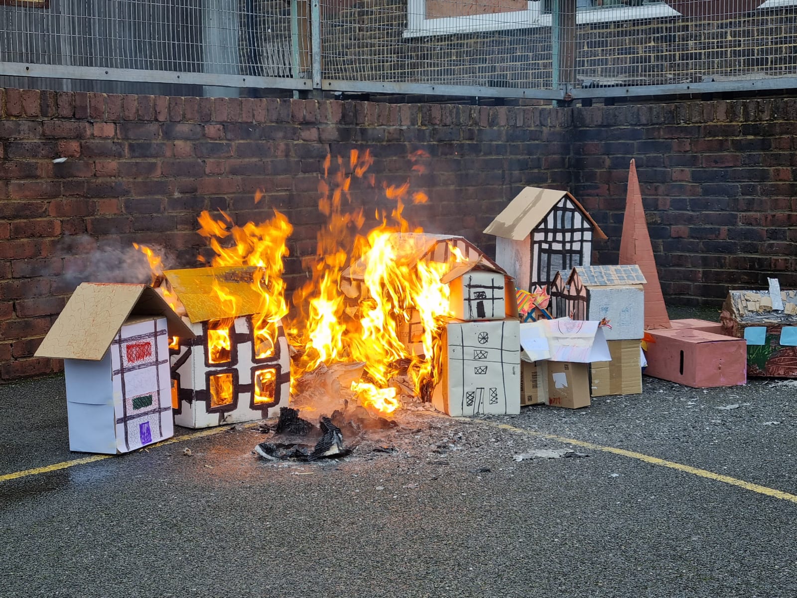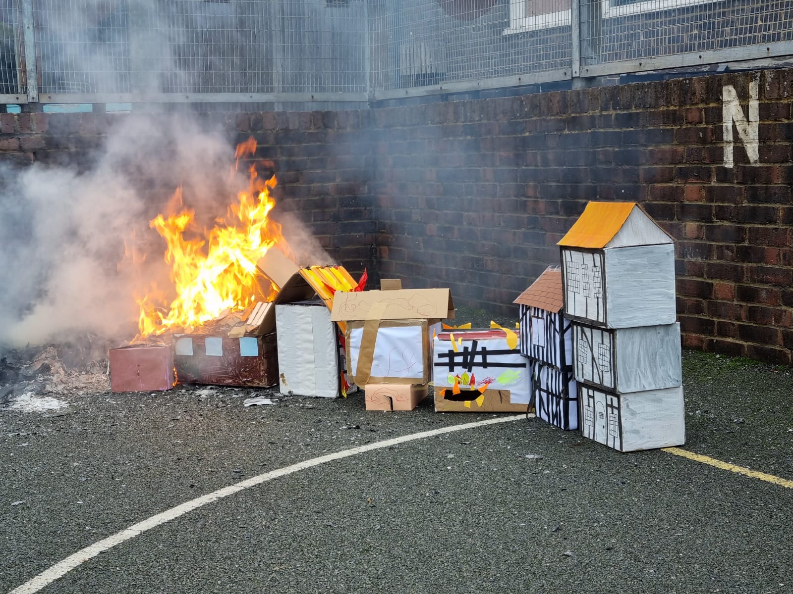 Today Y1 recreated the Great Fire of London in the Eleanor Palmer playground. With the strong wind, the fire spread quickly from the closely packed houses and we experienced the sights and sounds of the fire. After we talked about how London was rebuilt to avoid such mass fires in the future.