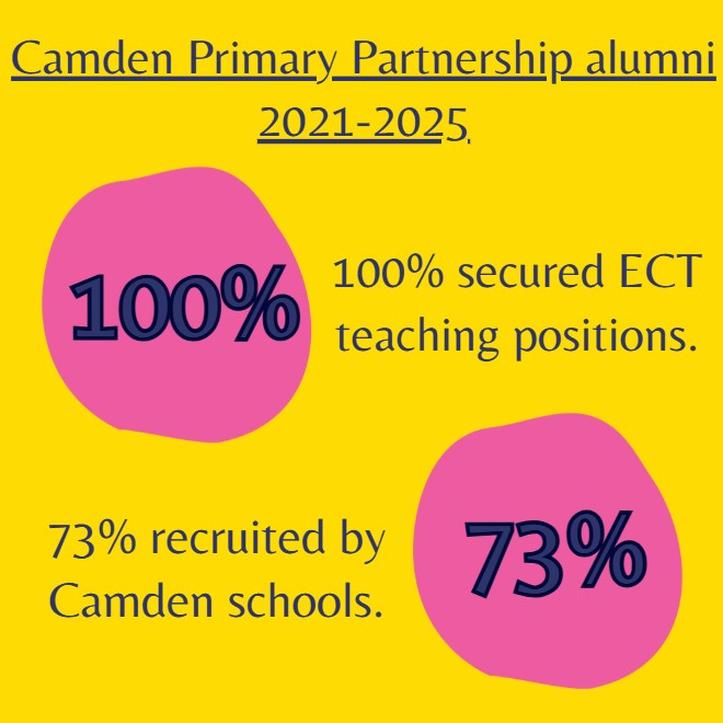 A phenomenal 73% of our 2021-2025 cohorts have gone on to be recruited by Camden schools. Many of our PGCE graduates now mentor new teachers and hold leadership roles across the borough. Local headteachers look to our pool of alumni when recruiting and always comment positively on the impact of our nurturing, rigorous route. We are proud to grow reflective, confident and passionate teachers that Camden schools are keen to hire!